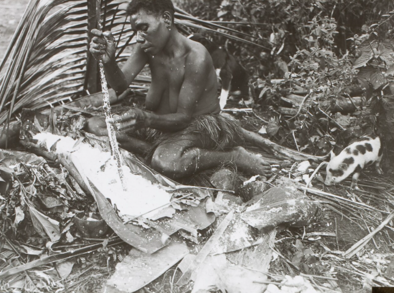 Une femme ni-Vanuatu préparant le laplap. Photographie d’Edgar Aubert de la Rüe (1901-1991), réalisée entre 1934 et 1935 sur l’île de Tanna, Tafea, au Vanuatu. © Musée du quai Branly – Jacques Chirac, https://www.quaibranly.fr/fr/explorer-les-collections/