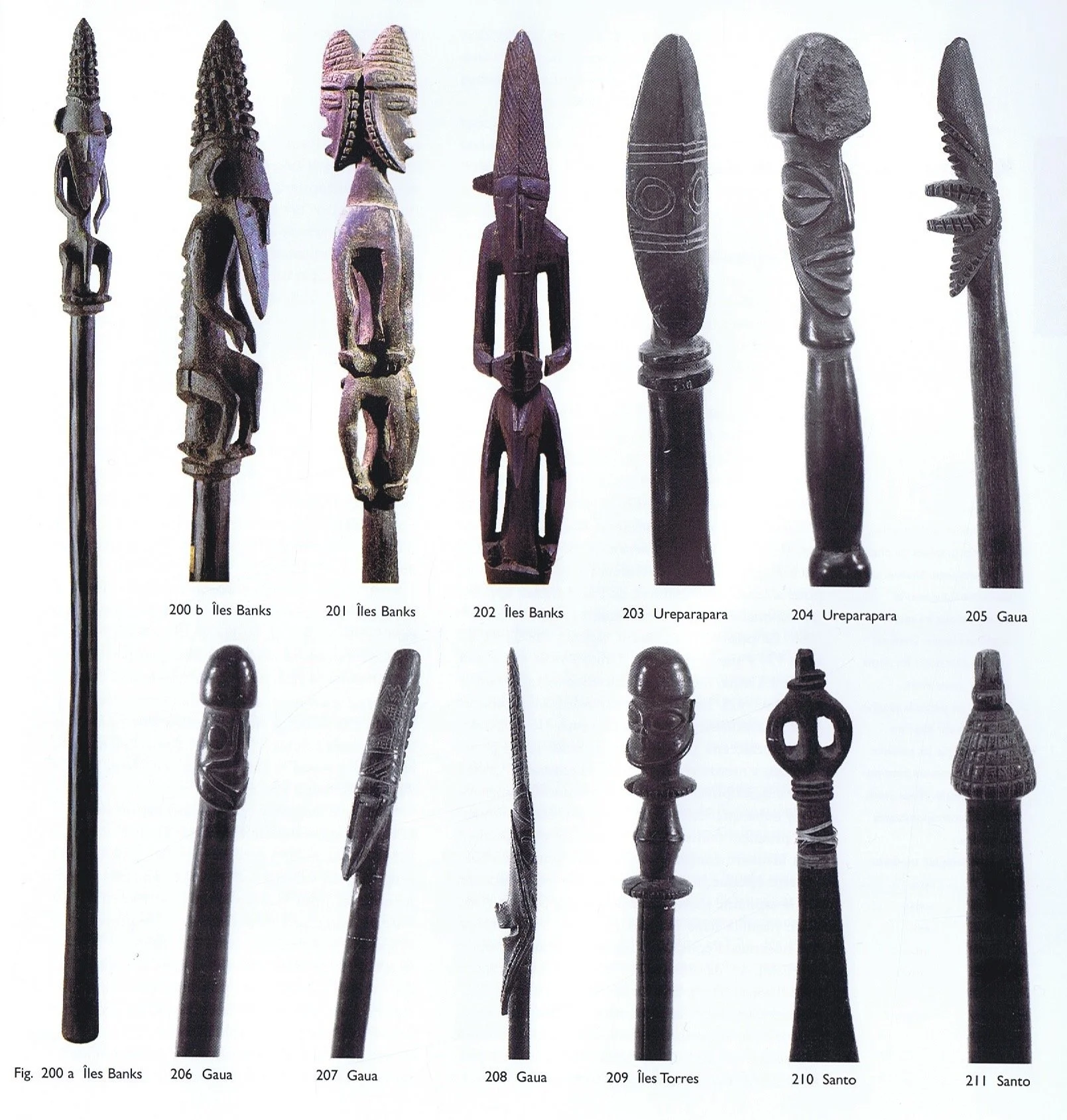 La variété de formes et de motifs de ces objets est particulièrement bien illustrée dans les superbes planches de dessins publiées par l’anthropologue suisse Félix Speiser dans Ethnology of Vanuatu : An Early Twentieth Century Study en 1996.