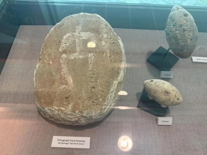 Photograph of the pictograph from As Quiroga Cave collected by Hans Hornbostel in the 1920s, on display at Guam Museum in September 2025 after its return. ©Uriah Aguon/Pacific Daily News, https://www.guampdn.com/news/once-again-home-collection-of-chamoru-artifacts-on-temporary-display-at-guam-museum/article_4205c229-21f6-4f6e-85cf-7555d8ec857e.html
