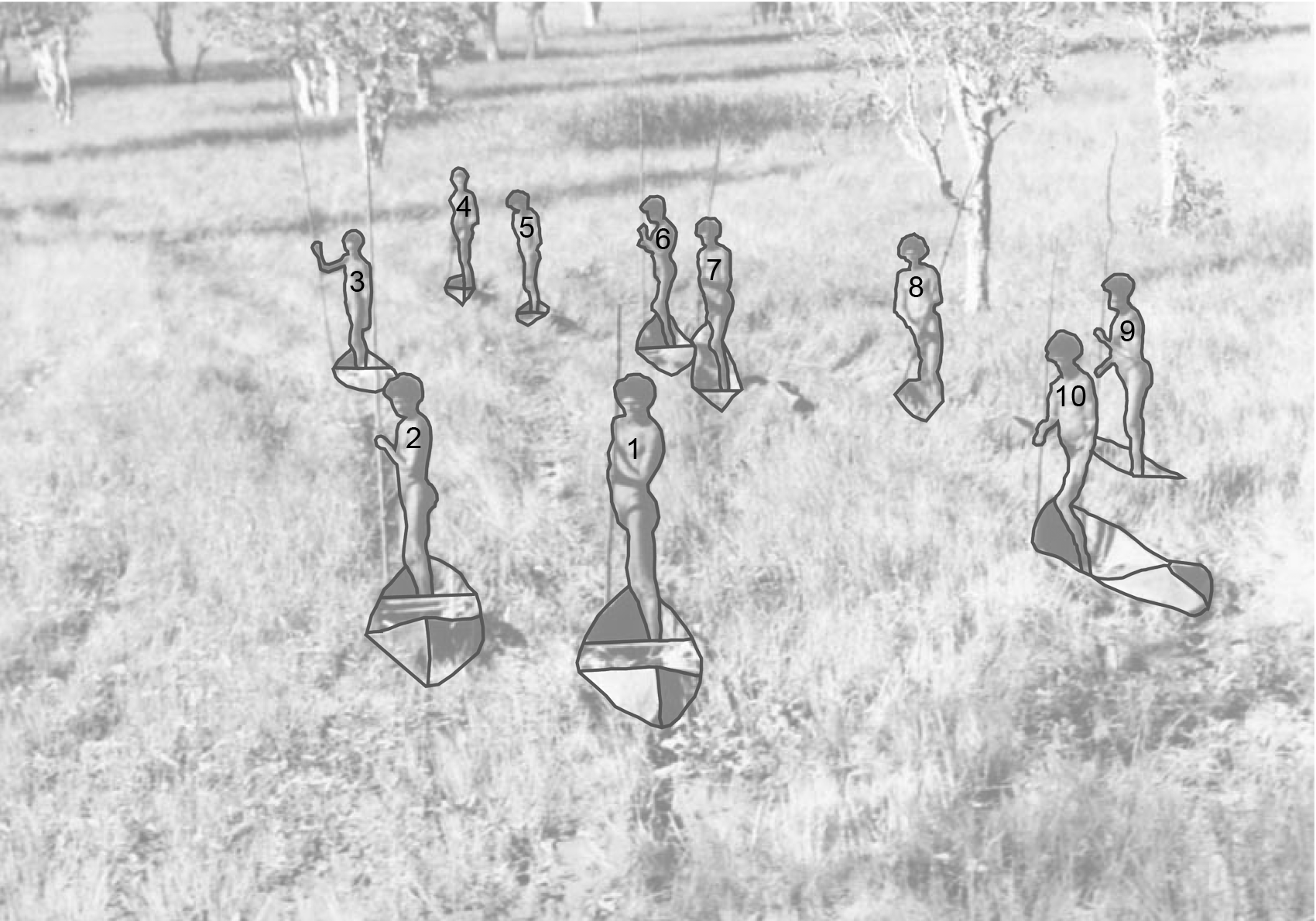 L’importance des liens de parentés est mis en avant ici :(1) Ngulmarmar; (2) Marrakaywarr; (3) Djarri; (4) Gunyirrnyirr; (5) Ngulang #2; (6) Mangan; (7) Guminydju; (8) Dhulumburrk; (9) Dhunupirri; (10) Kikirri. Dessin fait par Louise Hamby à partir d’une photo de Thomson. IN HAMBY, L., 2007. “Thomson Times and Ten Canoes (de Heer and Djigirr, 2006)”. Studies in Australasian Cinema 1 (2), p. 131